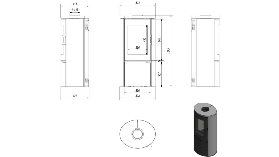 - Диаметр дымохода, (мм) 150